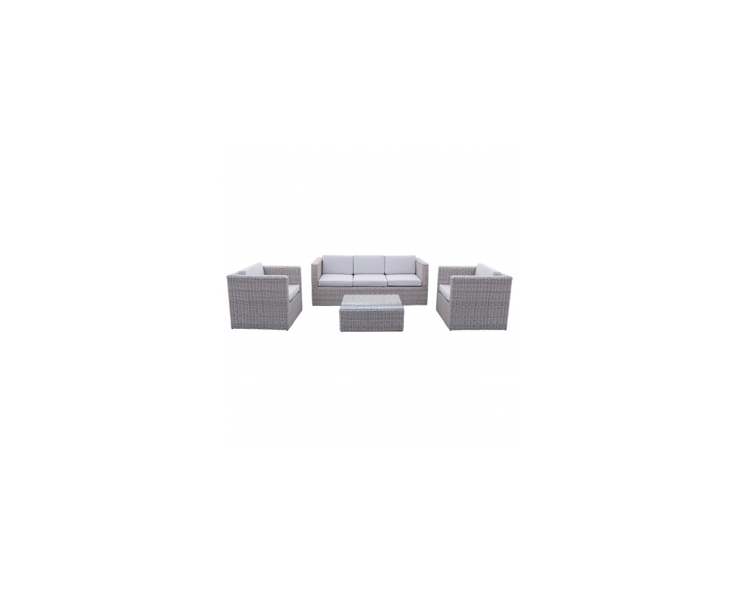Salotto da giardino composto da divano tre posti, 2 poltrone e tavolino. Struttura in metallo verniciato ricoperto di polyrattan. Cuscini con fodera in poliestere, sfoderabili e lavabili. Imbottitura in poliestere. Tavolino con piano in vetro trasparente temperato da 5 mm. Il salotto Capri si caratterizza per la grande resa estetica del materiale assolutamente simile al rattan naturale. Dimensioni: divano 200x80x74 cm - poltrona 85x80x74 cm - tavolino 85x68x33 cm. Disponibile in due varianti colore: grigio o naturale. Imballo: il salotto giassemblato, confezionati in 2 scatoloni.