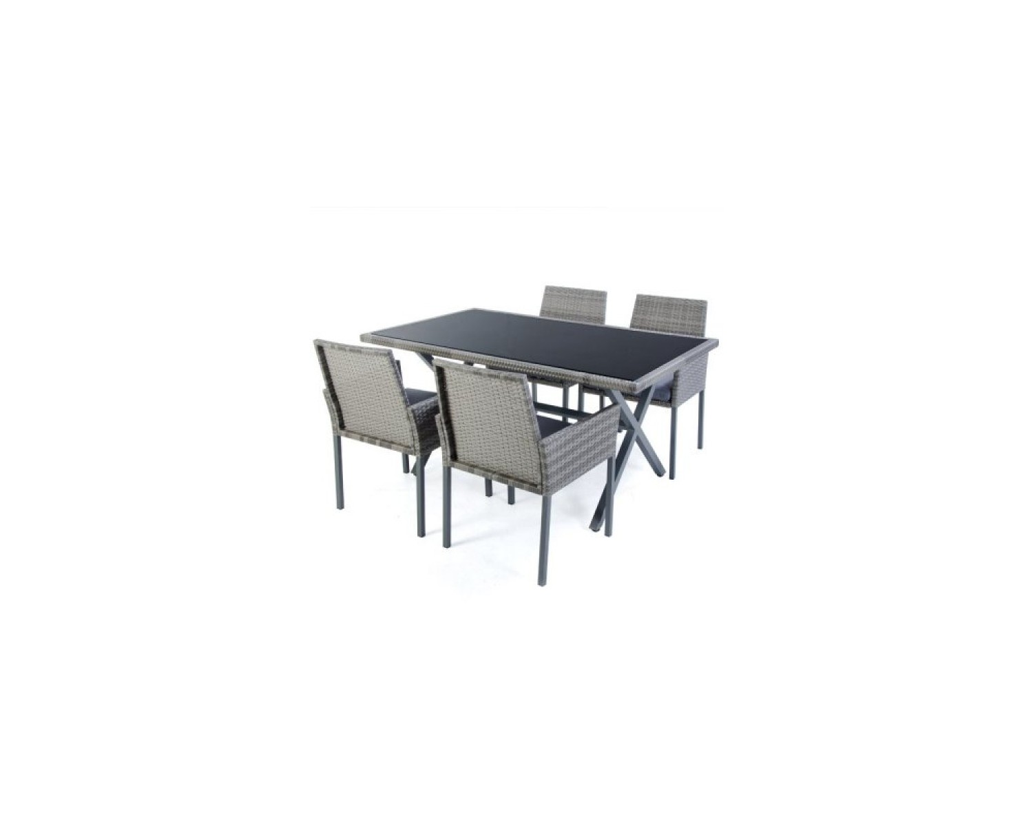 Set dining con struttura di metallo verniciato ricoperto di polyrattan, composto da tavolo (150x90x72 cm) e 4 sedie (57x59x84 cm). Cuscini in poliestere sfoderabili. Tavolo con top in vetro temperato nero da 5 mm. Colore: grigio. Set da assemblare, fornito in 3 scatole.