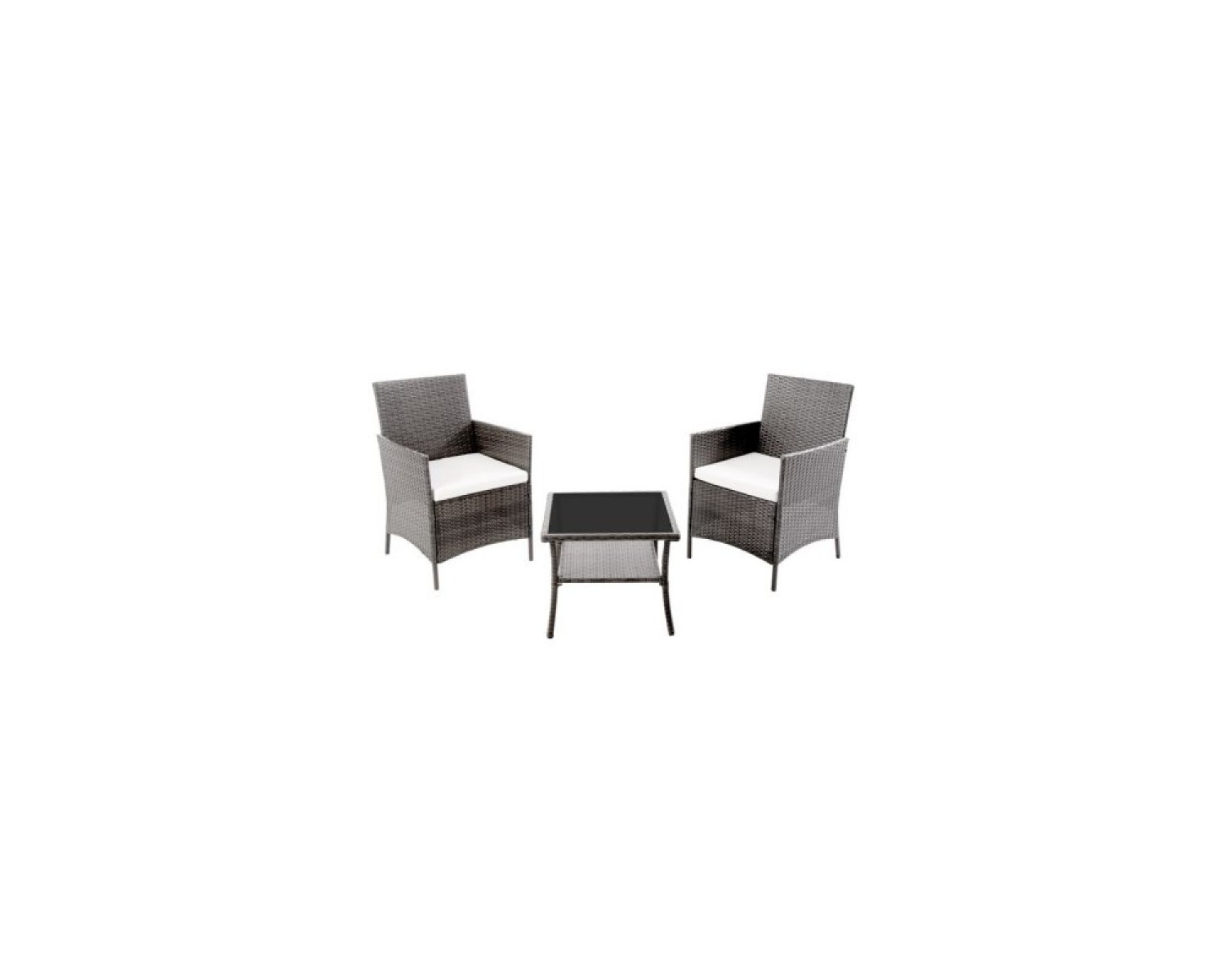 Set poco ingombrante, perfetto anche che per un balcone in citt Composto da 2 poltroncine e un tavolino. Struttura in metallo verniciato ricoperto in polyrattan. Cuscini in poliestere sfoderabili e lavabili. Tavolino con piano in vetro temperato nero da 5 mm. Dimensioni: tavolino 51x51x42 cm - poltroncina (2x) 58x54x82.5 cm. Colore: grigio. Imballo: articolo da assemblare, fornito in scatola di cartone.