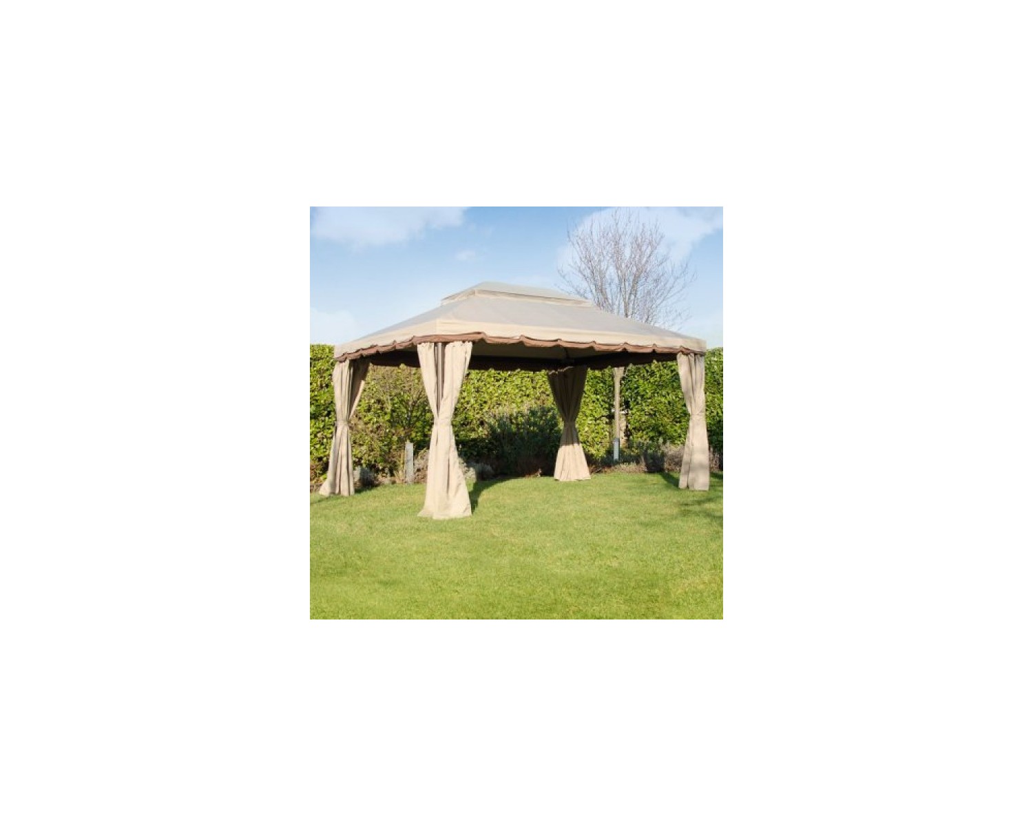 Gazebo Roma con struttura in alluminio verniciato. Pali 80 mm. Telo di copertura in poliestere da 200 gr/mq, tendaggi laterali in poliestere da 160 gr/mq. Dimensioni disponibili 3x3 m o 3x4 m - H. 2.70 m. Confezione: scatola di cartone. Disponibile telo di copertura superiore di ricambio e kit zanzariere laterali.