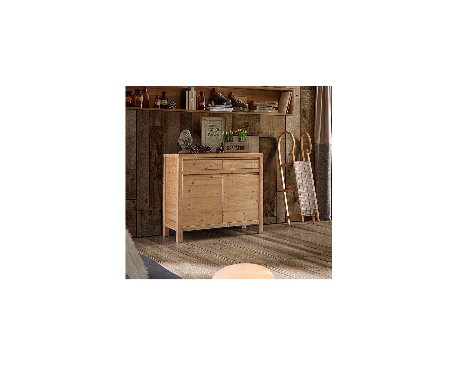 Credenzina 2 ante 2 cassetti 1 ripiano. Guide ammortizzate. Cod. 3312/A Misure: Larghezza Cm. 104 Profondit Cm. 50 Altezza Cm. 95 Materiali: legno massello di Abete. Schienale e fondi dei cassetti in compensato. Guide dei cassetti ammortizzate.