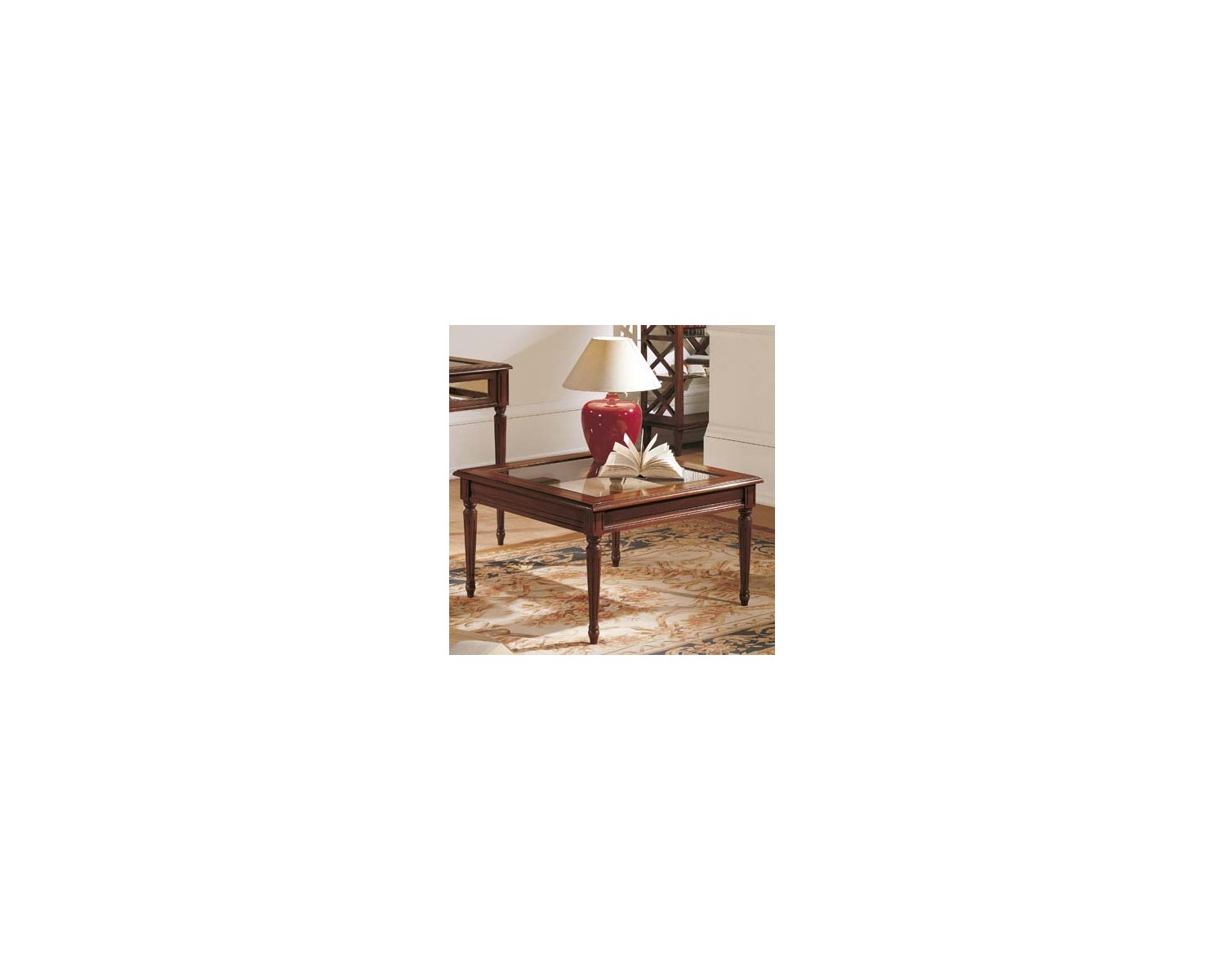 TAVOLINO CON FILETTO, PIANO IN VETRO E GAMBA TORNITA L.80 H.46,5 P.80