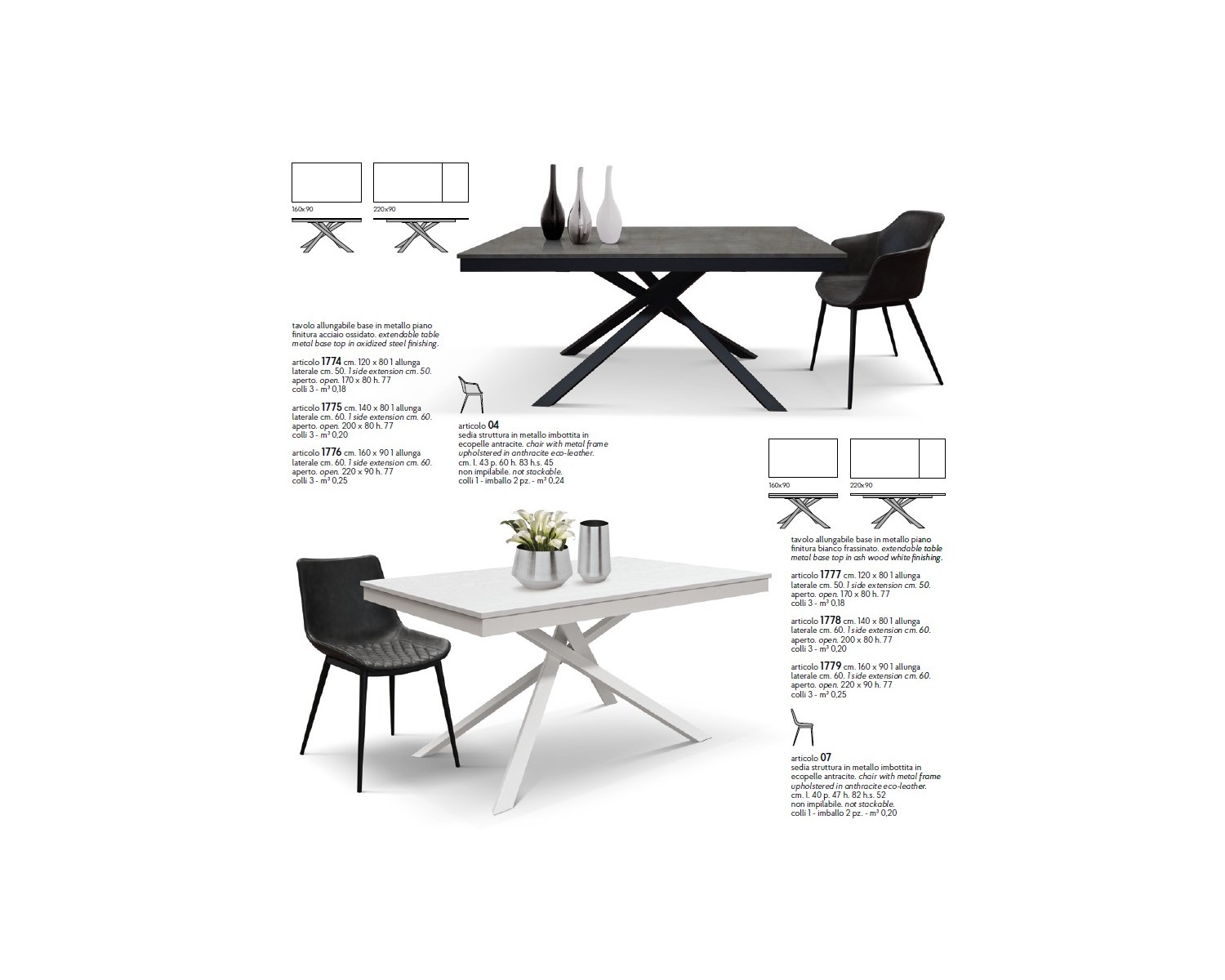 Tavolo allungabile 120x80 con 1 all. cm. 40 base metallo e piano finitura acciaio ossidato