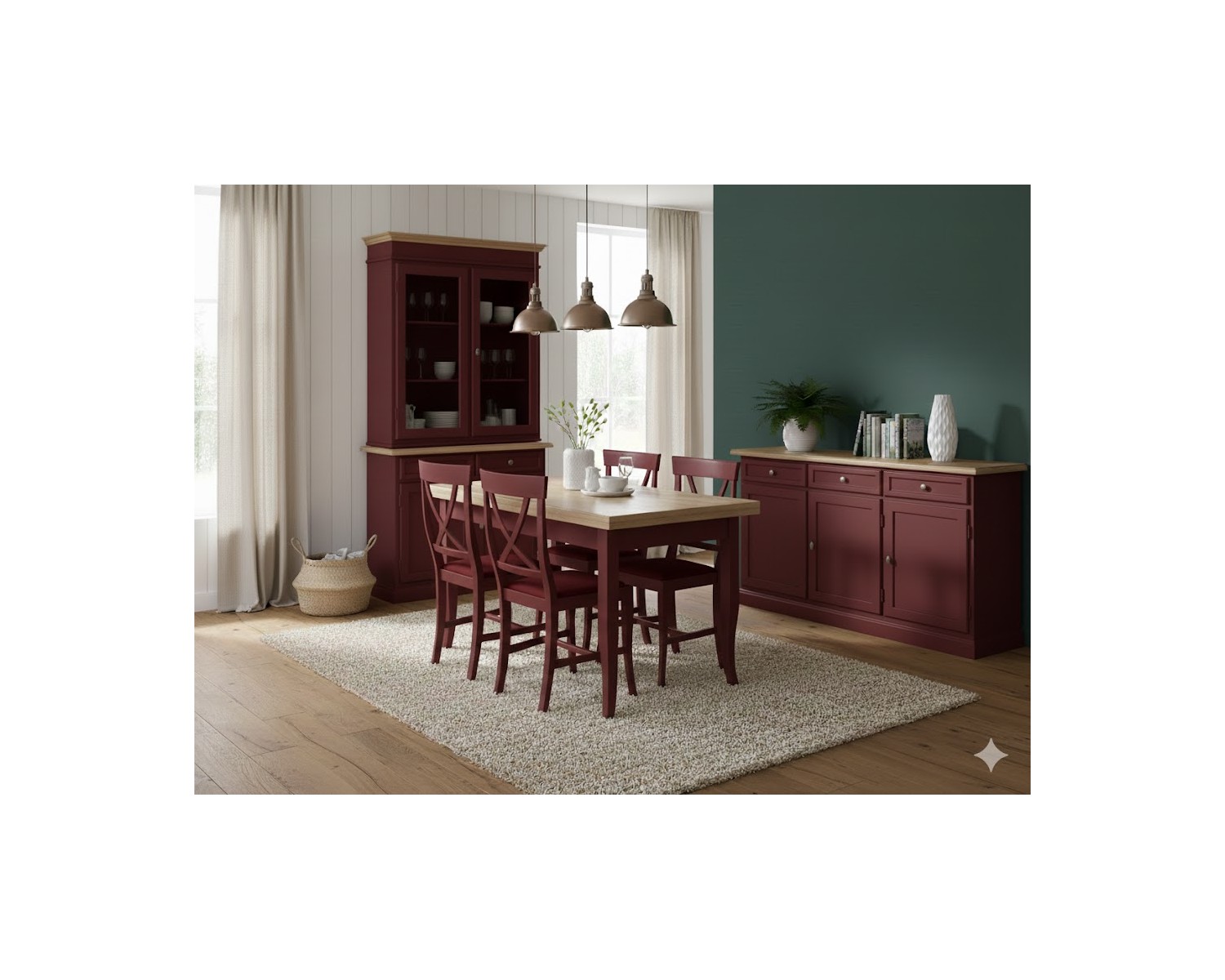 SALA COMPLETA VETRINA CREDENZA TAVOLO 4 SEDIE VARI COLORI LEGNO MASSELLO