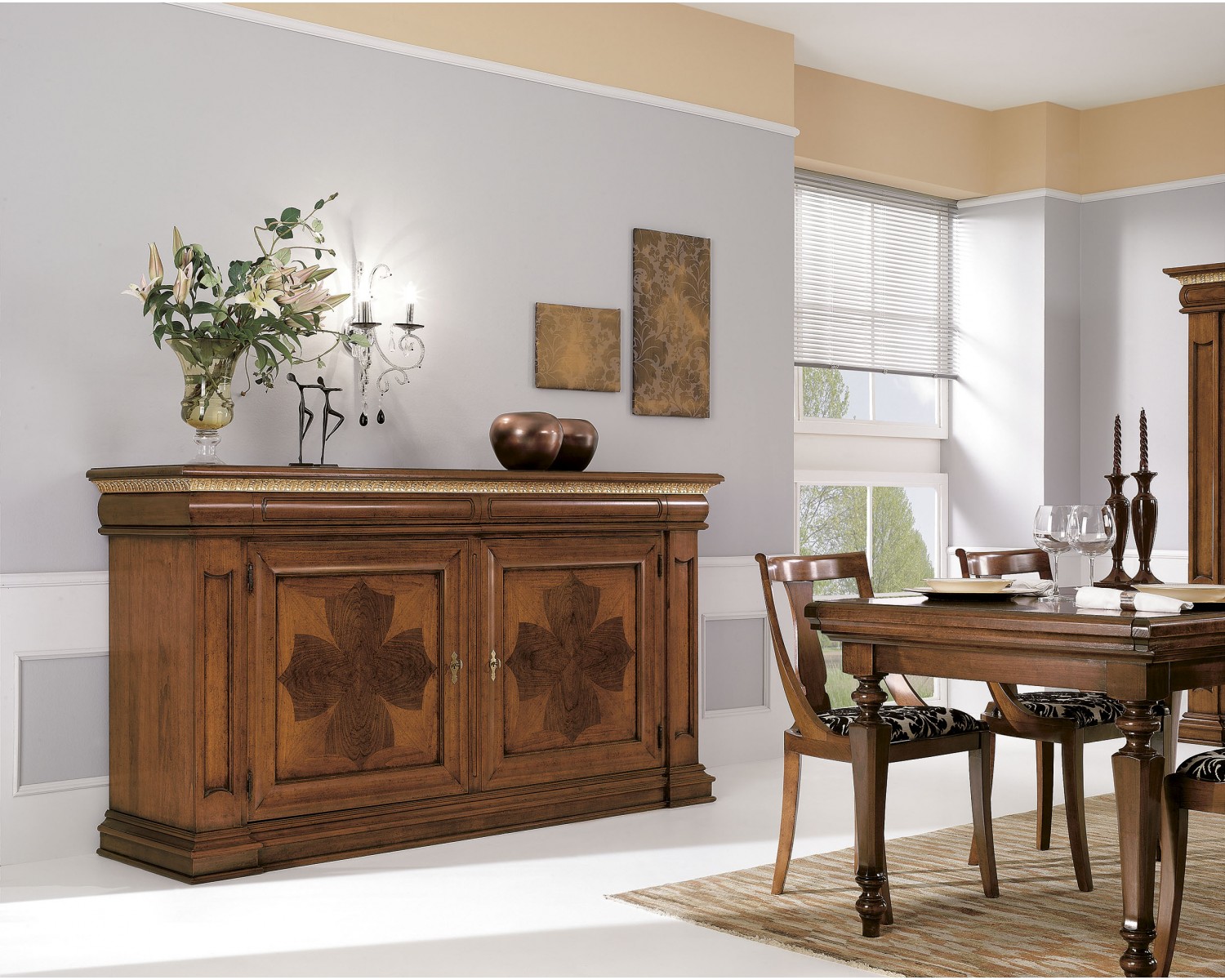 CREDENZONE IN LEGNO MASSELLO CON INTARSIO E PROFILO ORO FOGLIA L 211 P 58 H 114