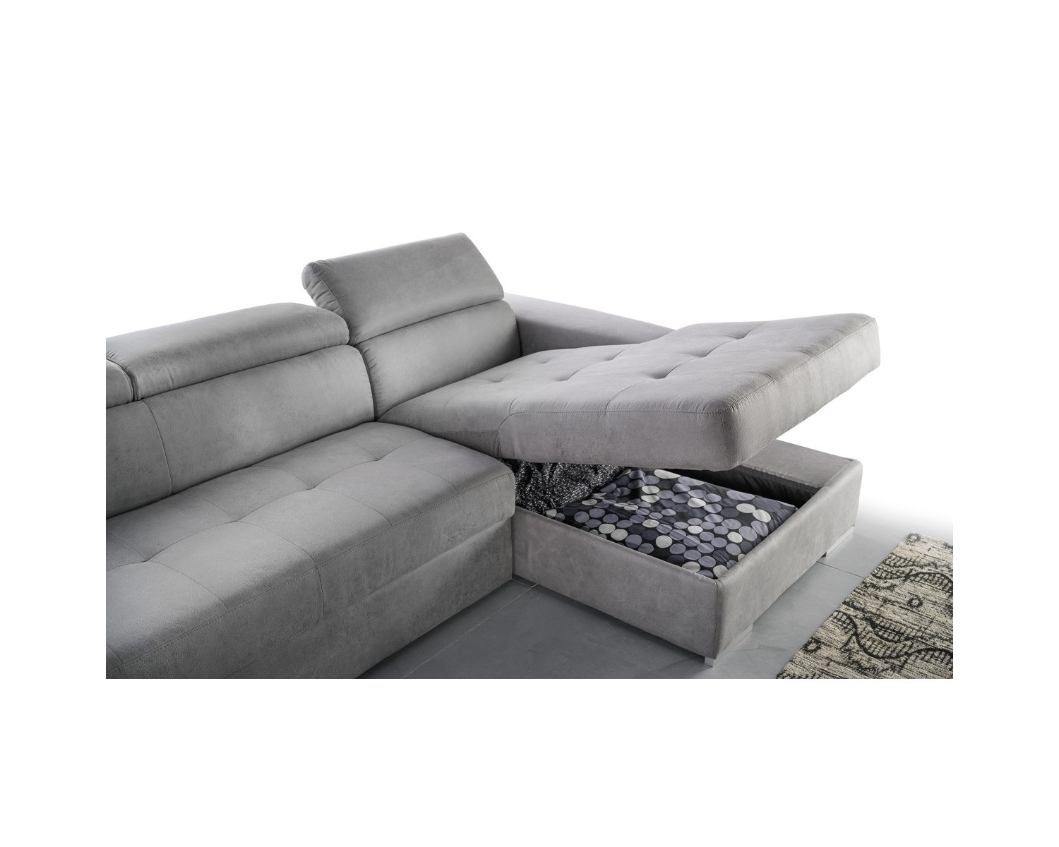 DIVANO CON PENISOLA CONTENITORE CON PANCHETTA L 270 P163 H 75-94 CM NON SFODERABILE - struttura: masselli portanti in abete - cuscini: in poliuretano espanso densita 28 kg - rivestimento: in tessuto a scelta- tempi di consegna: 45 giorni
