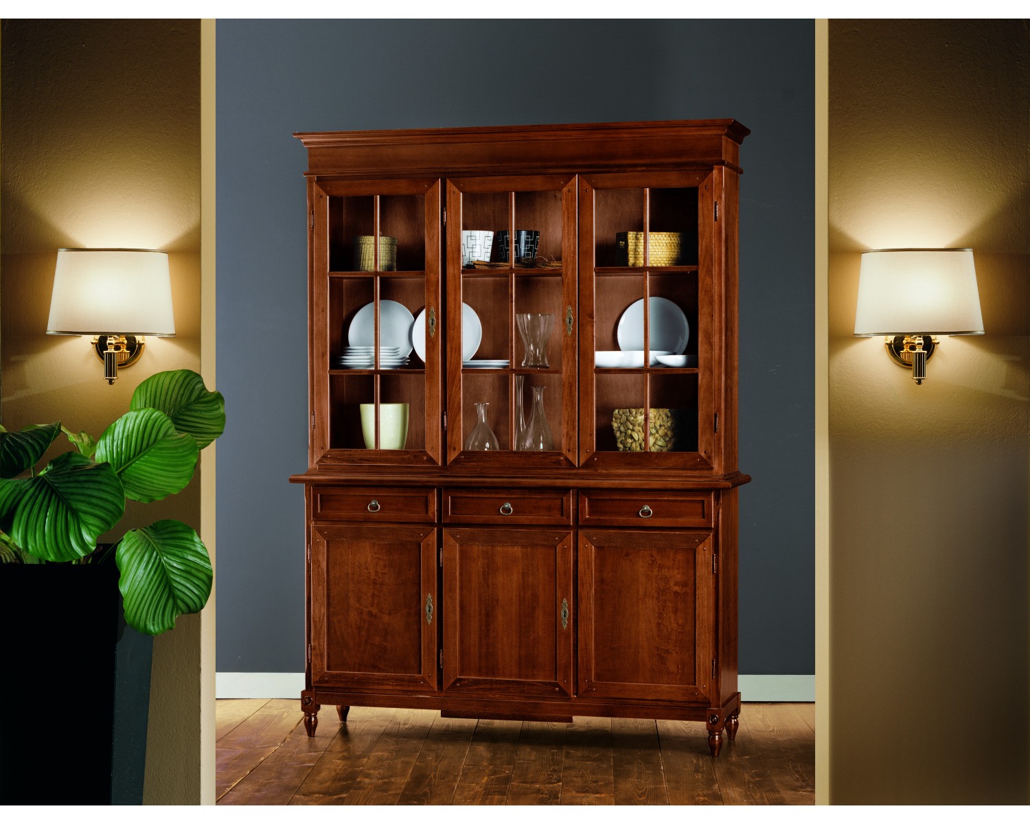 furniture sideboard 3 doors and 3 drawers with 3 doors showcase with solid shelves and agglomeration rustic walnut excellent artisan quality delivery 20-25 days shipping throughout Italy DIMENSIONS L 156 P 42 H 213