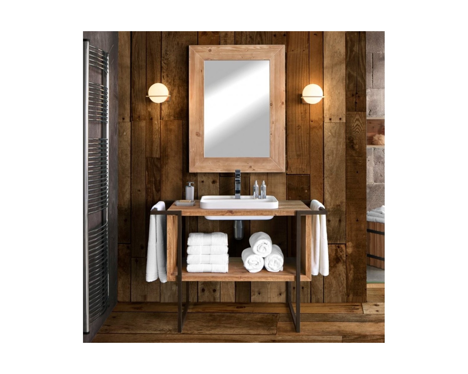 Mobile bagno gambe in ferro. Cod. 3314/A Misure: Larghezza Cm. 120 Profondit Cm. 56 Altezza Cm. 83 Materiali: legno massello di Abete. Gambe in ferro. Mineral marmo. Con foro centrale per miscelatore. Cod. 3315/A Misure: Larghezza Cm. 55 Profondit Cm. 39 Altezza Cm. 5 Materiali: fusione di resina e polvere di marmo. Finitura: colore bianco.