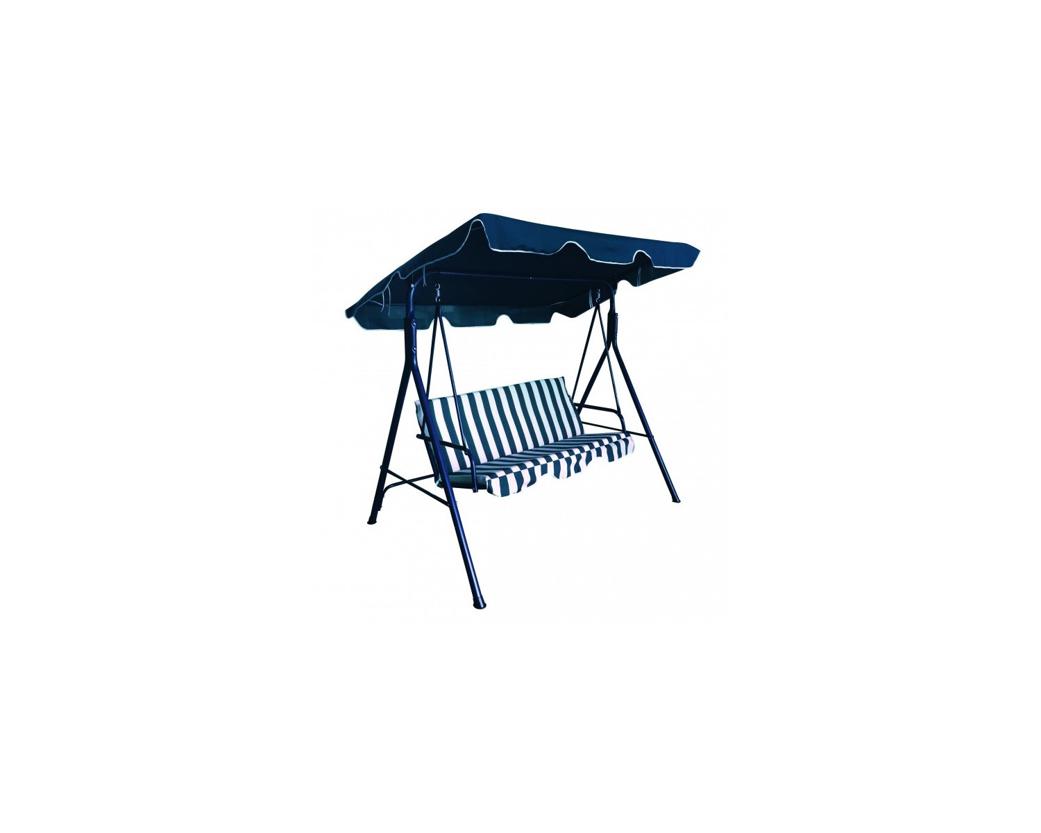 Dondolo 3 posti con struttura in acciaio verniciato. Copertura in Poliestere. Seduta e schienale con cuscino. Fodera Poliestere. Dimensioni: 170x115x153 cm. Disponibile in tre varianti colore: verde rigato, blu rigato e marrone. Articolo da assemblare, fornito con istruzioni di montaggio. Portata massima 210 Kg.