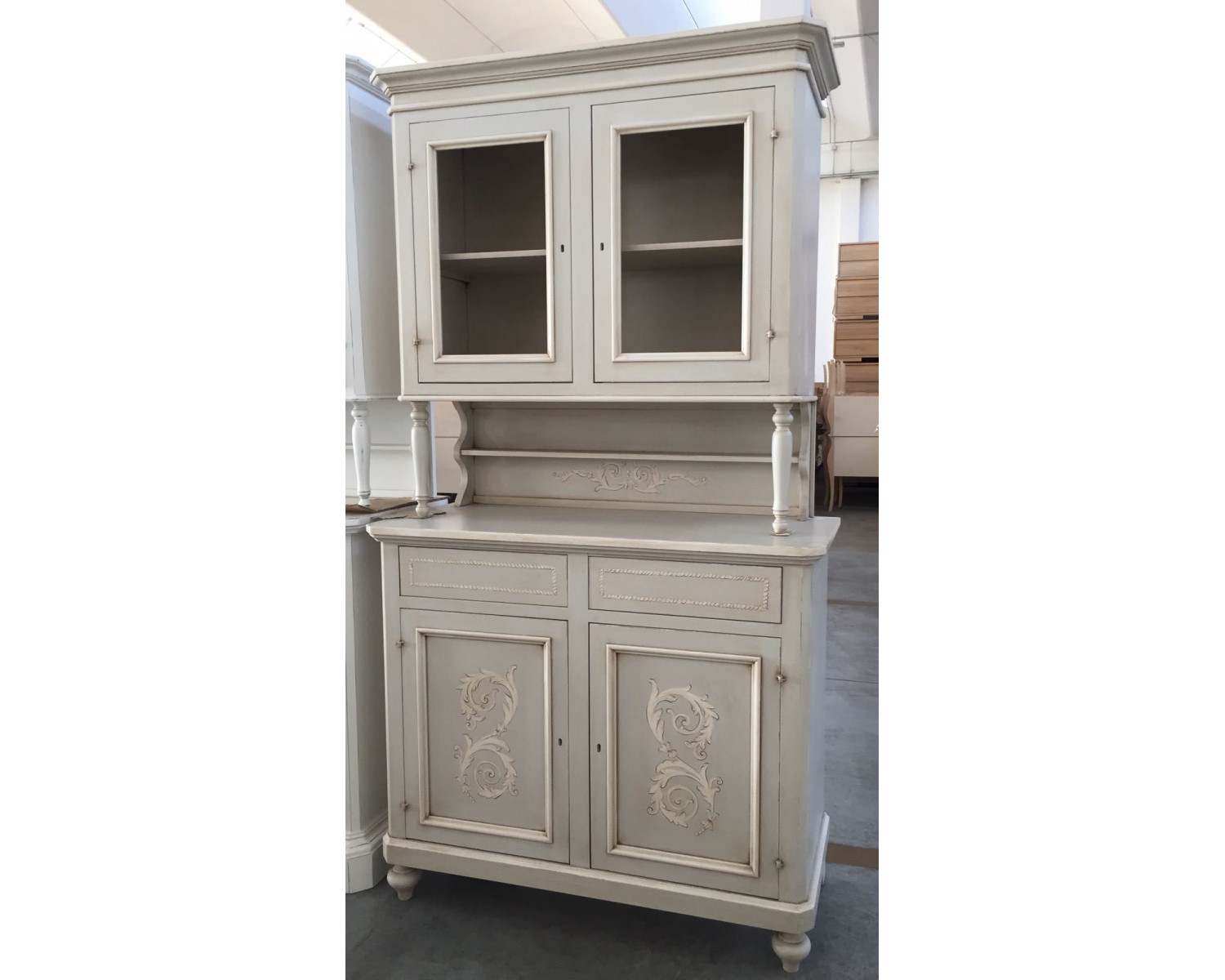 Bellissimo mobile in legno massello e agglomerato conmposta da credenza 2 ante e 2 cassetti con alzata vetrina 2 ante finitura avorio anticato con pannelli centrali finemente decorati mobile artigianale produzione veneta spedizione in tutta Italia tempi di consegna 20/25 gg