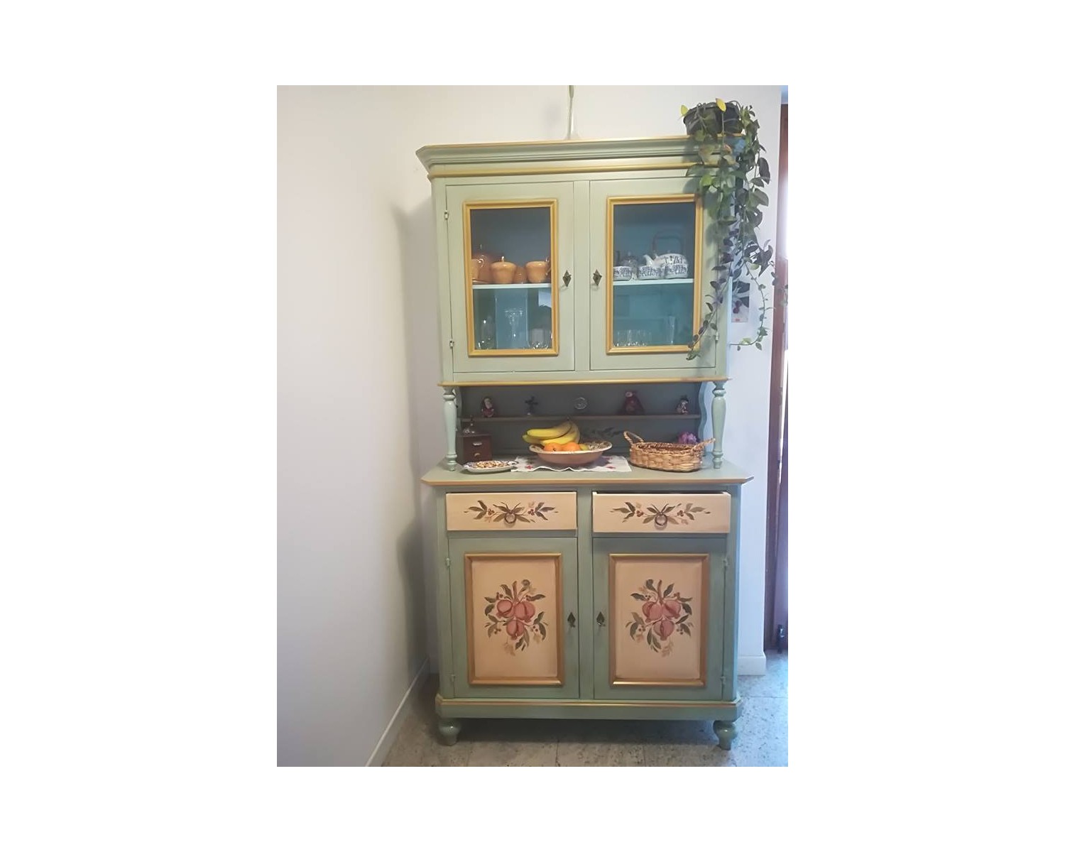 MOBILE CREDENZA CON ALZATA VETRINA LEGNO MASSELLO ARTIGIANALE DECORATO
