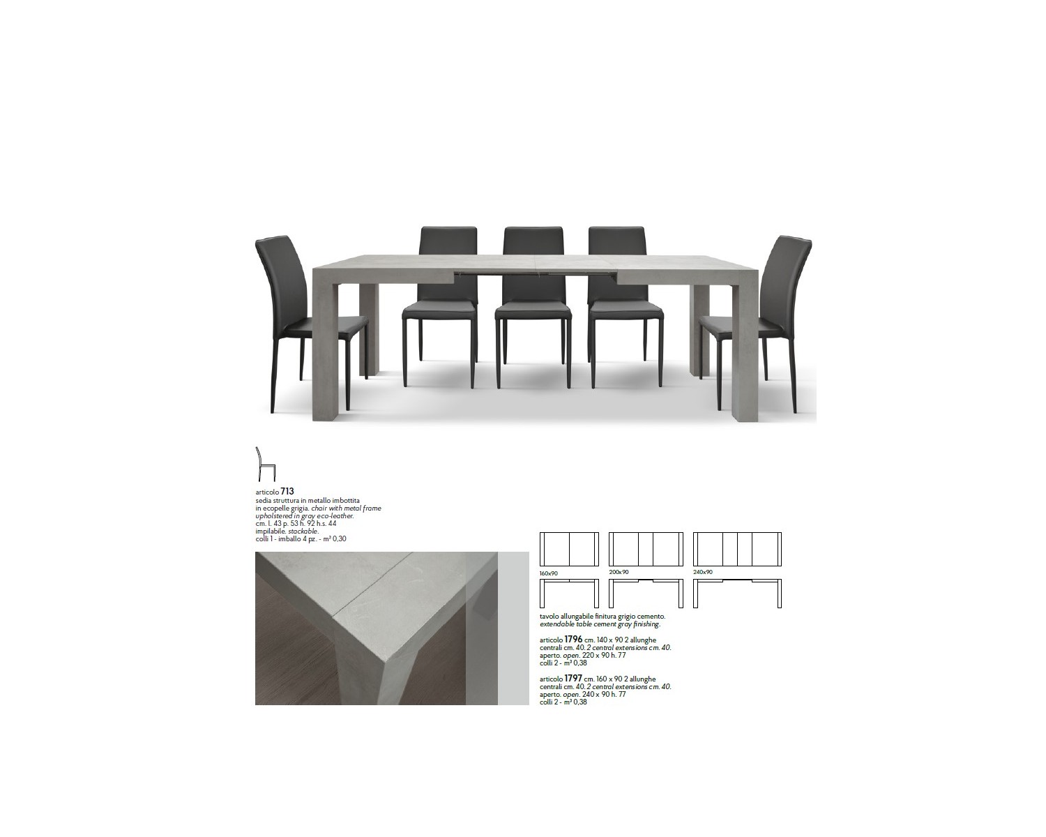 Tavolo allungabile 140x90 2 all. centrali cm. 40 grigio cemento