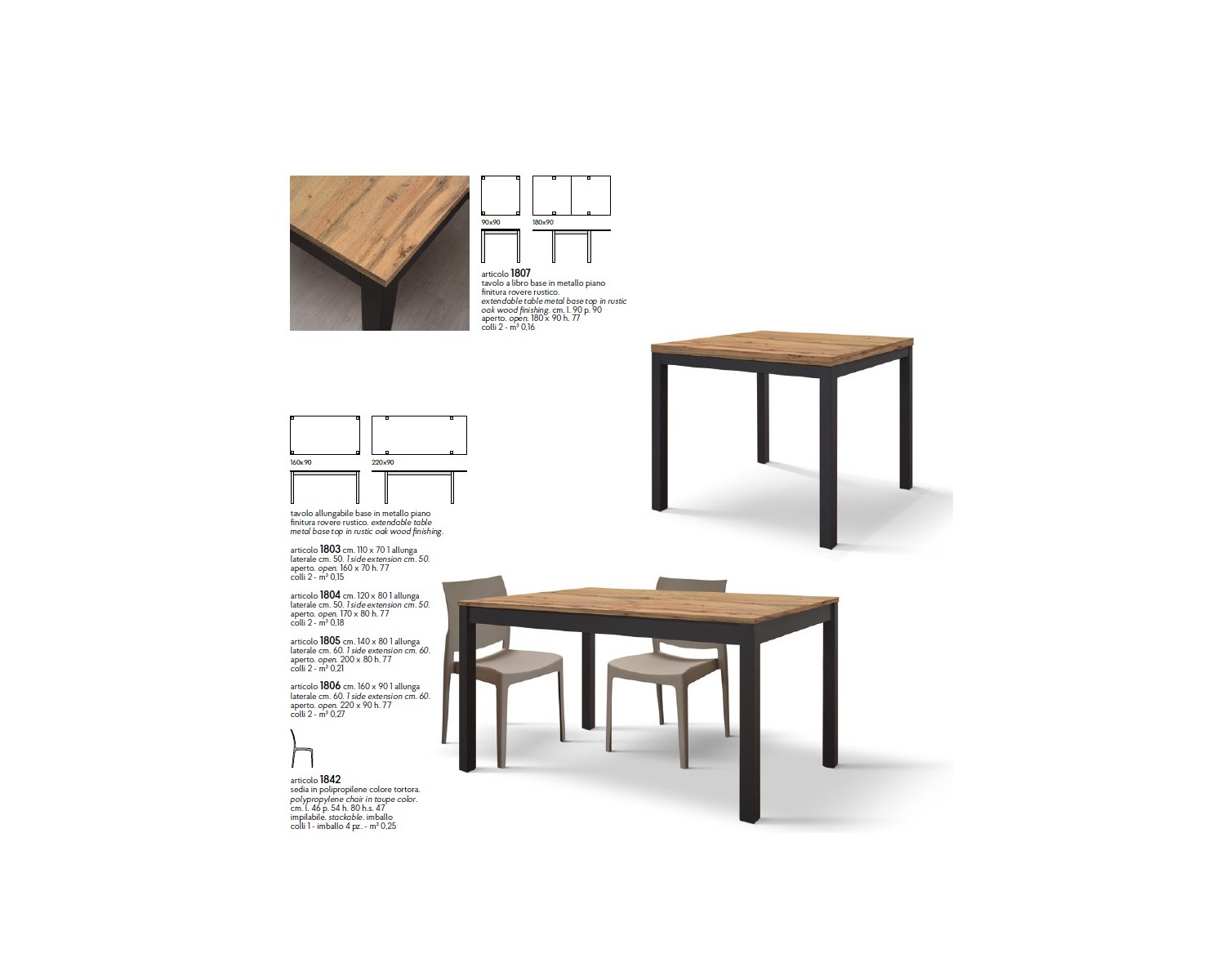 Tavolo allungabile 140x80 con 1 all. cm. 60 base metallo piano finitura rovere rustico