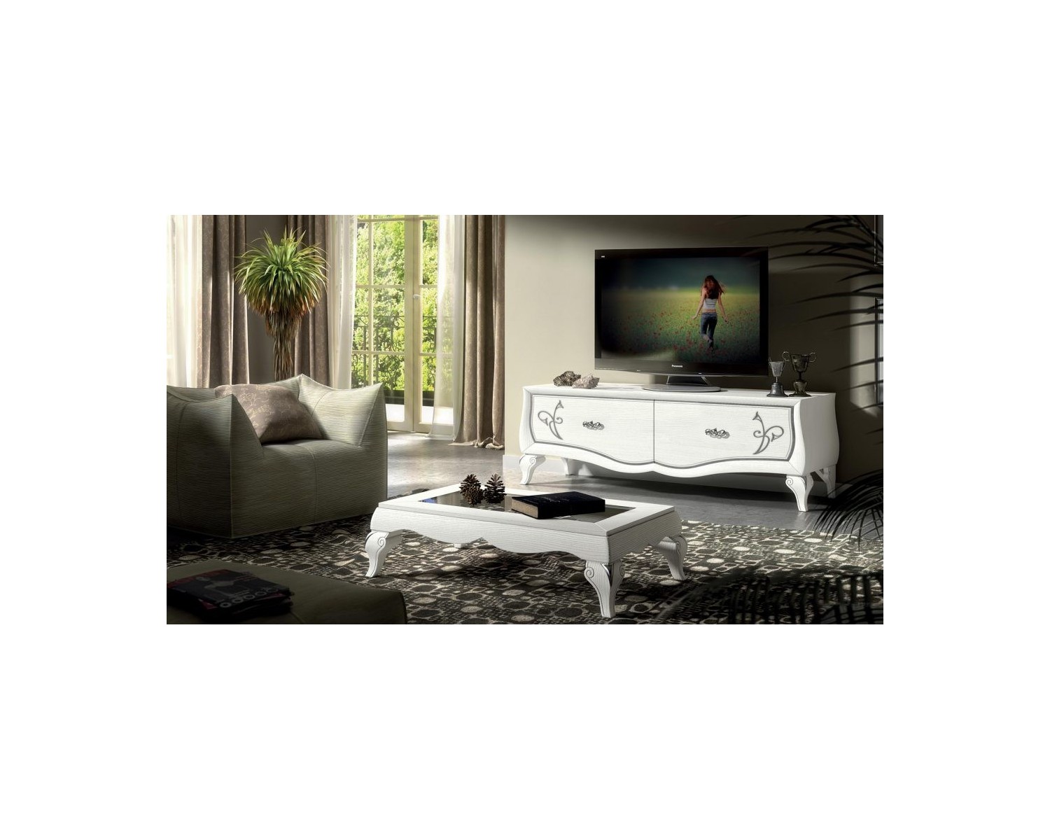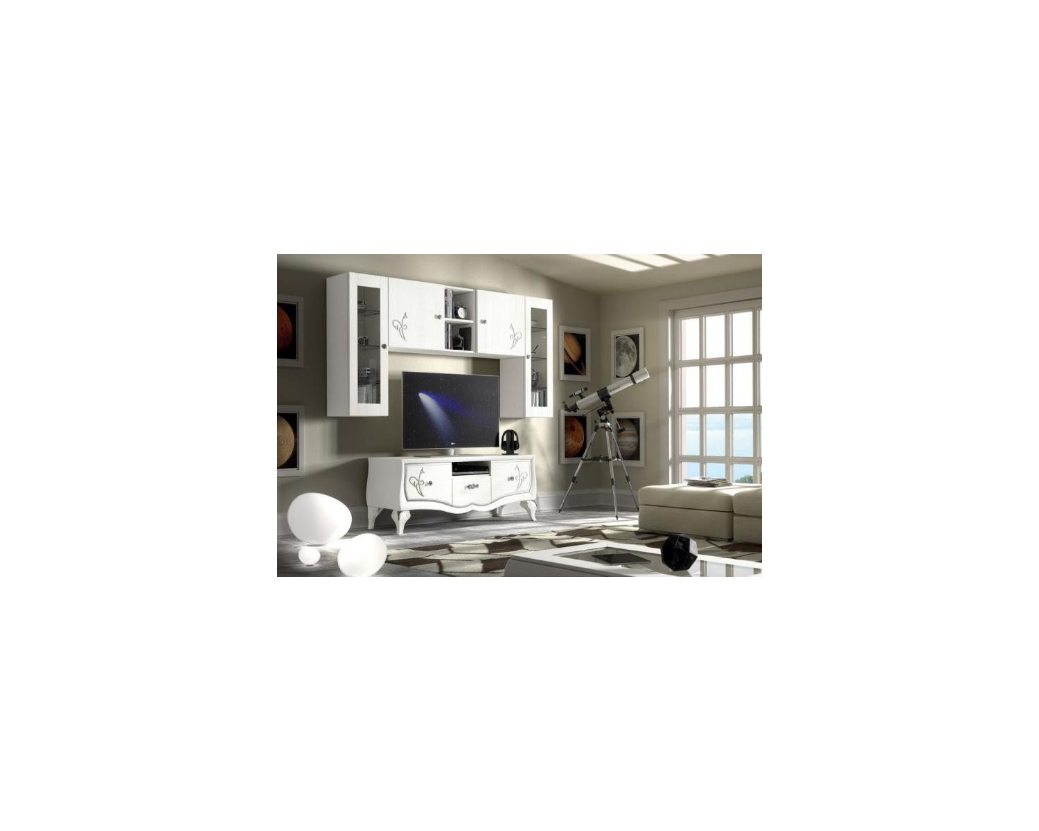 SOPORTE TV 3 CASSETTI1 DECORACIÓN APERTURA día con acabado blanco poro abierto ESPECIAL hoja de plata - TAMAÑO L154 P55 H63 - 20 días momento de la producción - Made in Italy