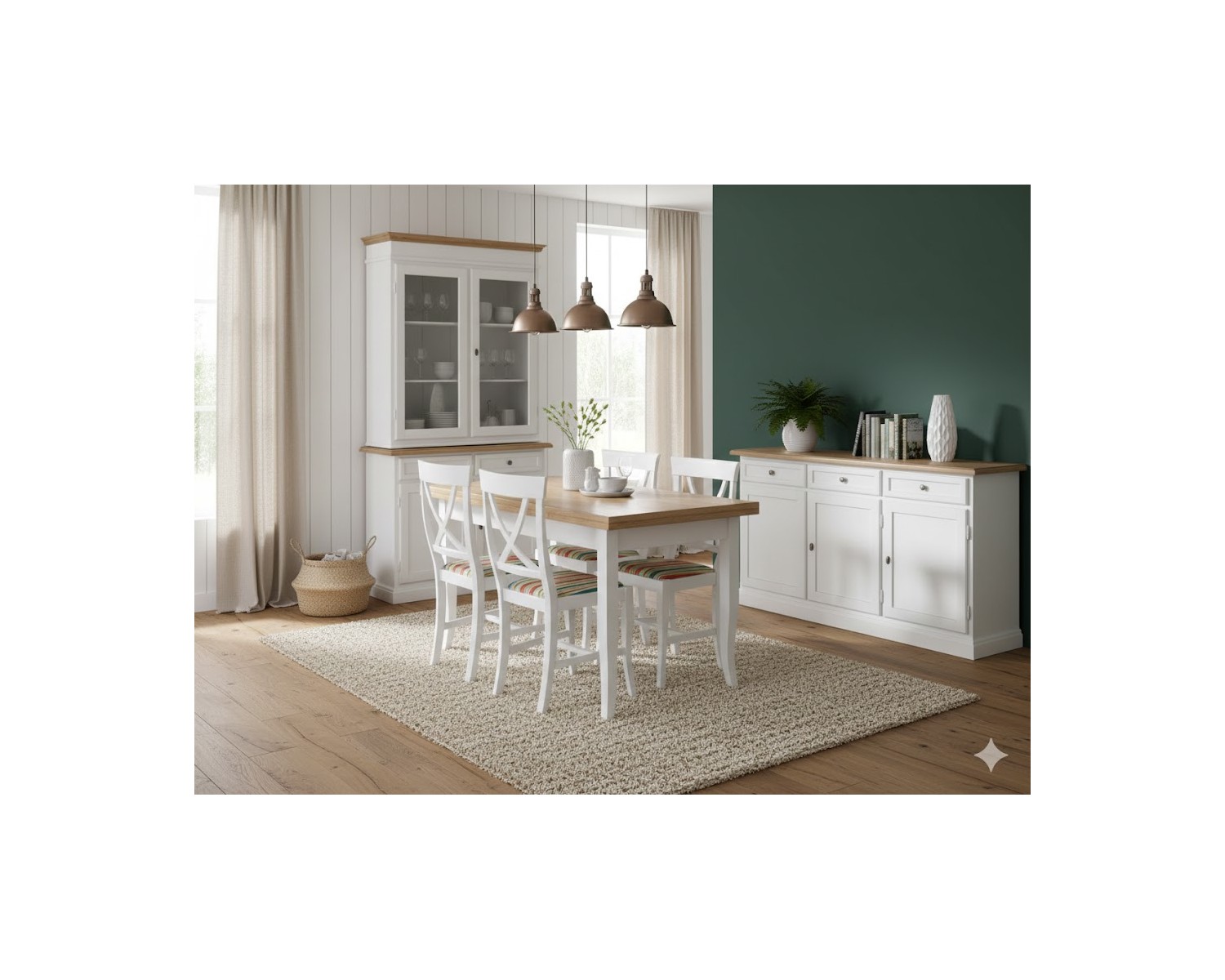 SALA COMPLETA VETRINA CREDENZA TAVOLO 4 SEDIE VARI COLORI LEGNO MASSELLO
