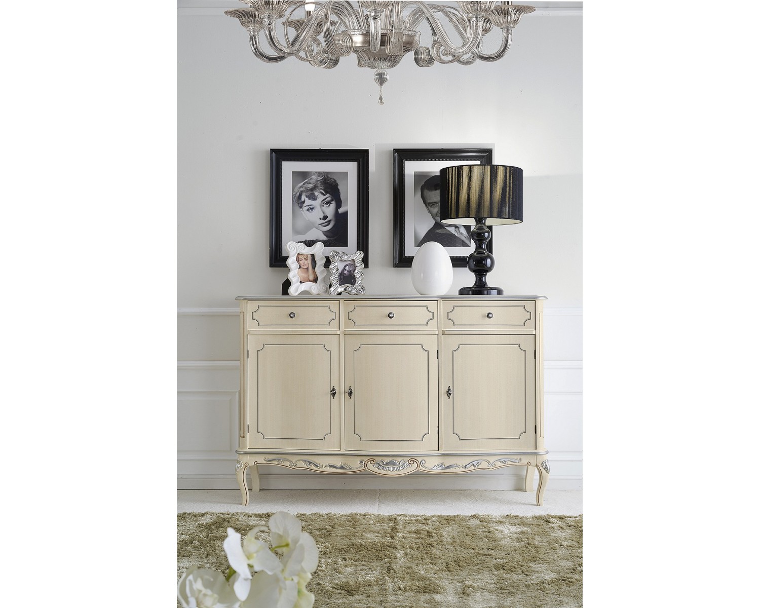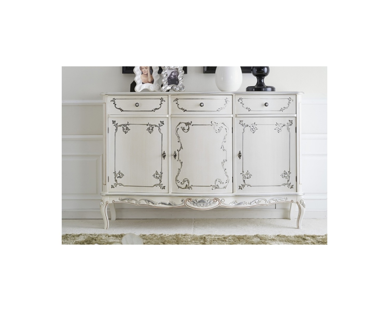 CABINET 3 PORTES 3 TIROIRS PLEINES bois marqueté AVEC MATT BLANC ARGENT PROFIL MAIN EN DECOREE PHOTO - DIMENSIONS L150 P59 H100 - MADE IN ITALY - PRODUCTION DE TEMPS DE 20 JOURS
