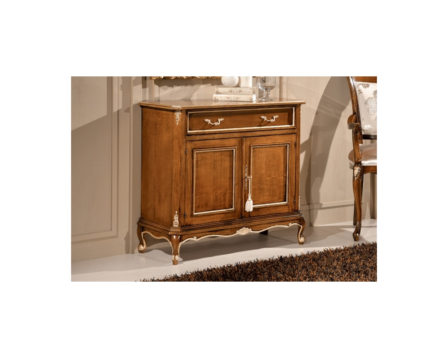 CABINET 2 PORTES 2 TIROIR bois marqueté AVEC NOIX DE COULEUR PROFILS D'OR EN PHOTO - DIMENSIONS L91 P35 H81 - MADE IN ITALY - PRODUCTION DE TEMPS DE 20 JOURS
