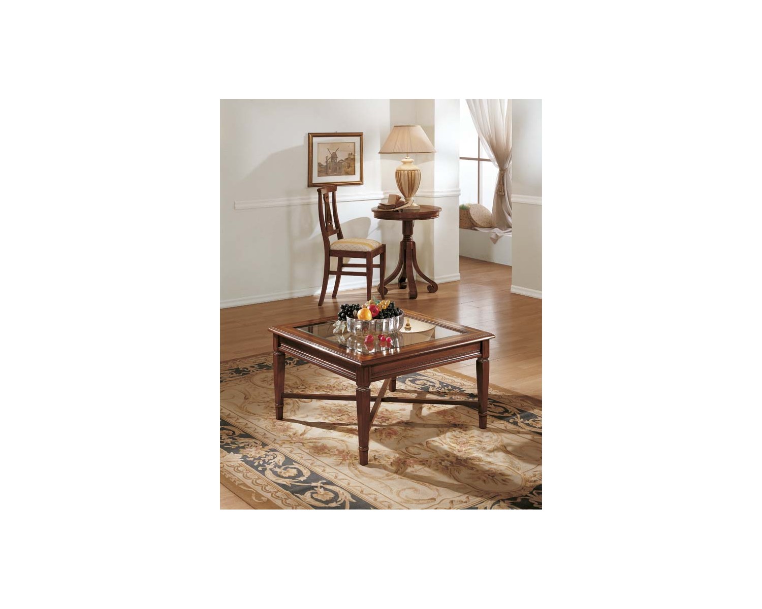 TAVOLINO C/FIL. PIANO IN VETRO E G/ SPILLO CON CROCIERA L.80 H.46,5 P.80