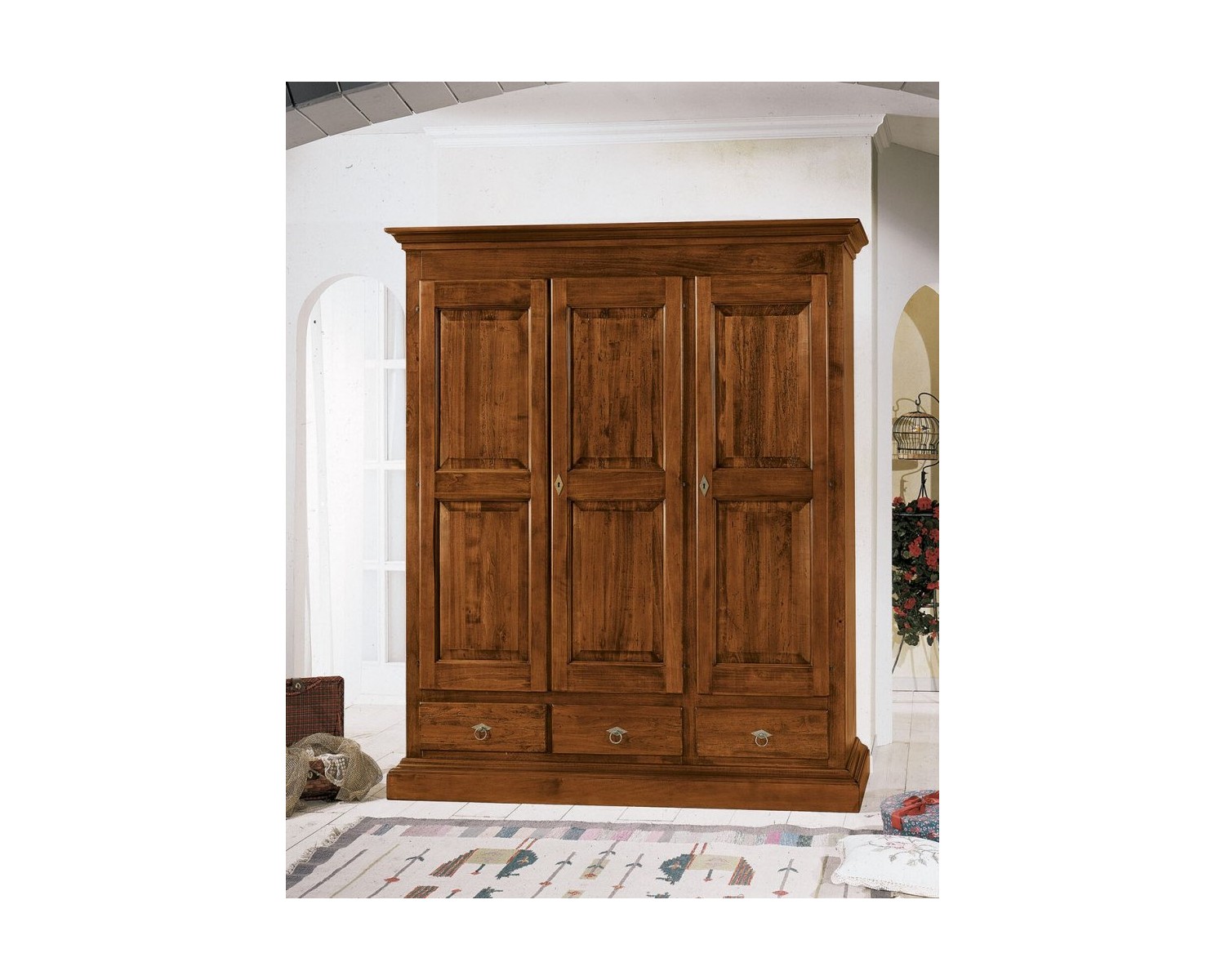 Armadio a 3 porte e 3 cassetti completo di 2 ripiani e 2 bastoni appendiabiti.