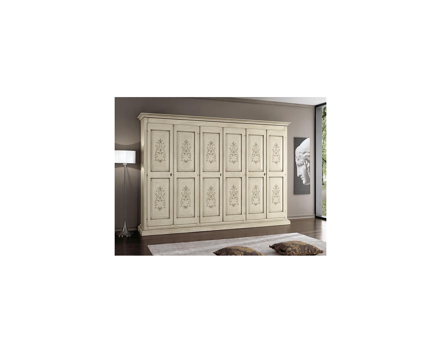 Armadio a 6 porte completo di 3 ripiani, 6 bastoni appendiabiti e 1 cassettiera interna a 3 cassetti.