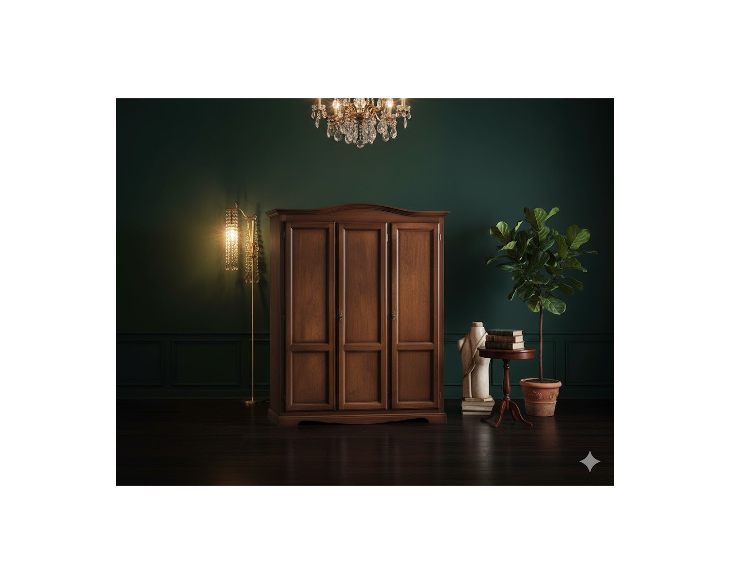 Armadio a tre ante realizzato in legno massello, caratterizzato dallo stile Arte Povera, ideale per ambienti classici o rustici. La finitura noce arte povera medio scuro valorizza le venature naturali del legno, conferendo calore ed eleganza all’ambiente.
