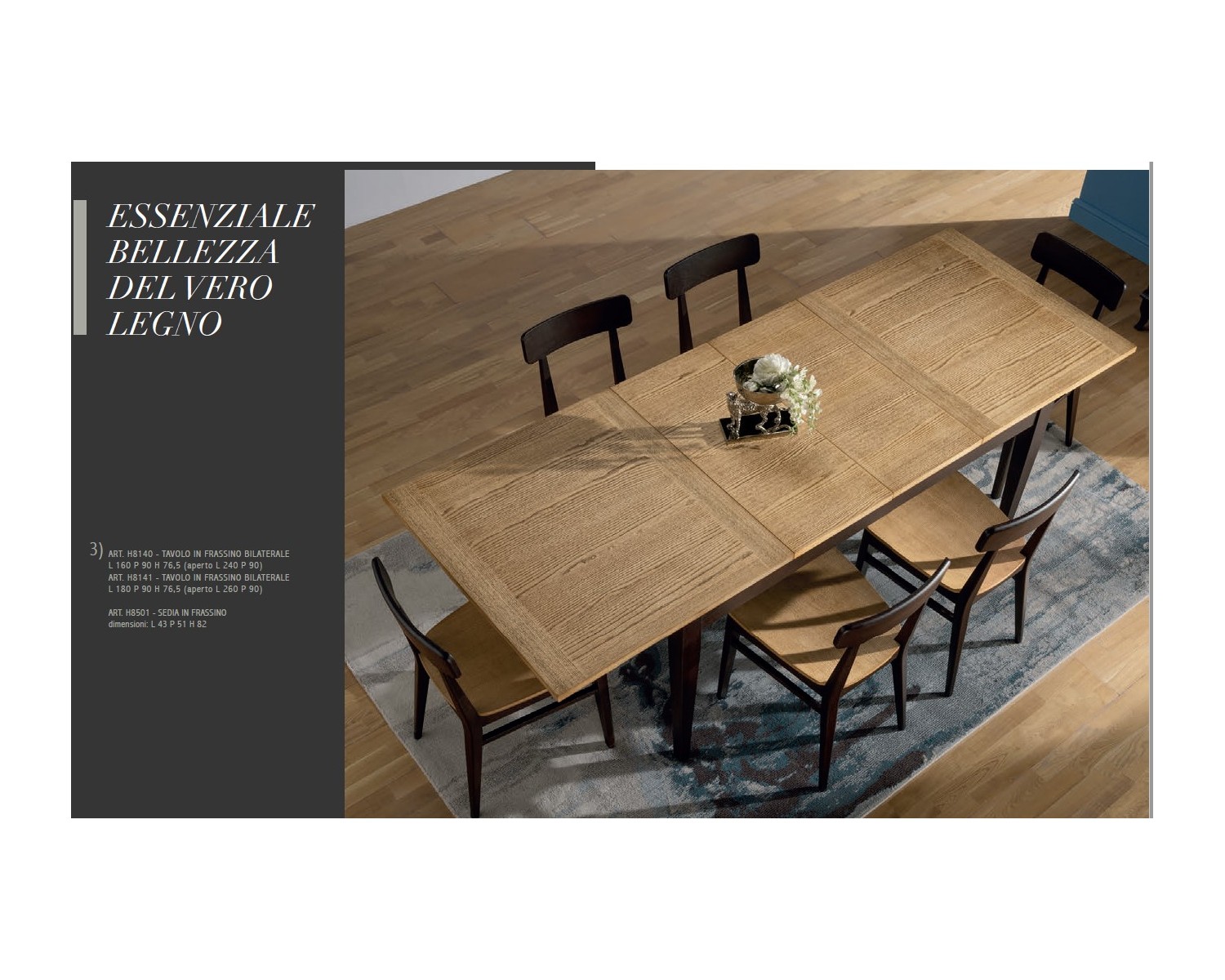 Tavolo in frassino apertura centrale bilaterale con 2 allunghe interne da 40 cm gamba spillo L.160 P.90 H.76,5 (aperto L.240 P.90)